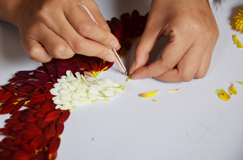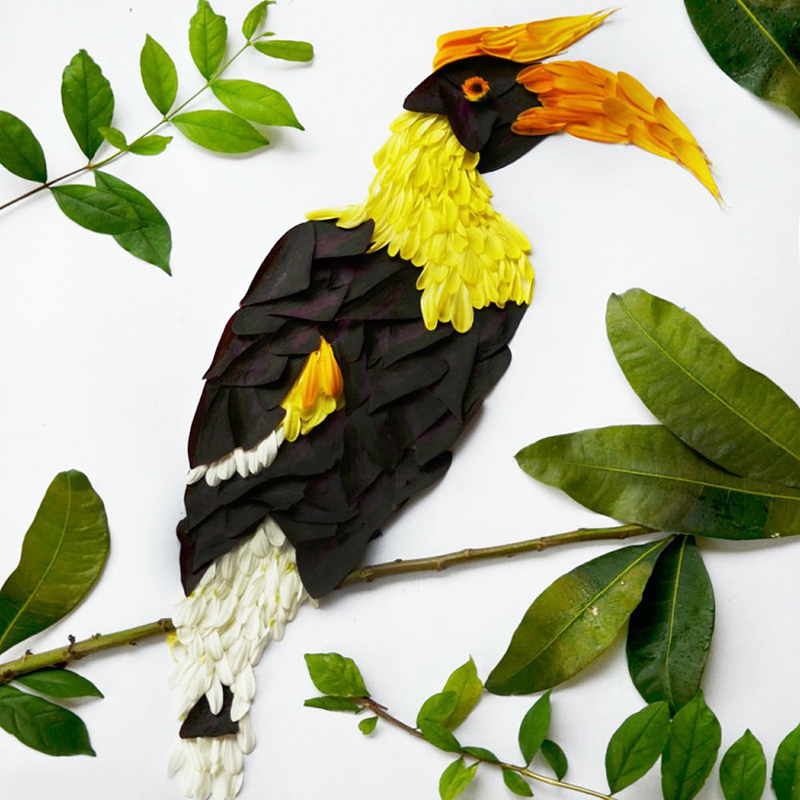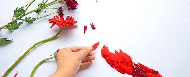 •October 27, 2013 • Leave a CommentKnown for creating images using numerous objects (and playing with her food), Red‘s work is extremely simple yet effective. In her new series, Red has meticulously plucked the petals of pretty flowers to reform them in the image of exotic birds in all their colourful glory: