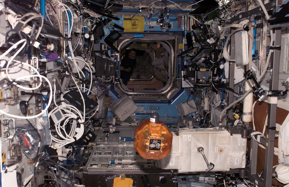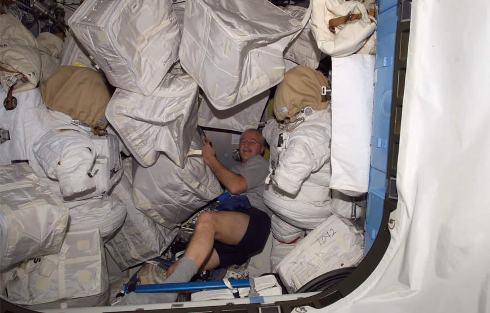SuitSat, an unneeded Russian Orlan spacesuit, was outfitted by the crew with three batteries, internal sensors and a radio transmitter, which faintly transmitted recorded voices of school children to amateur radio operators worldwide. The suit entered the atmosphere and burned a few weeks later.
