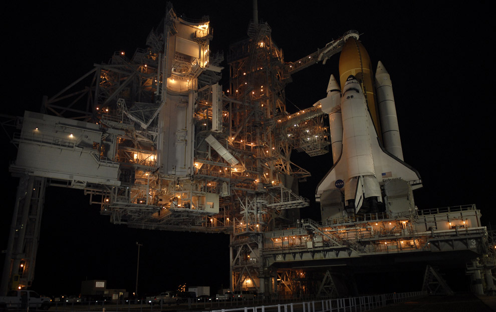 Above Endeavour’s external tank is the vent hood, known as the “beanie cap,” at the end of the gaseous oxygen vent arm, extending from the fixed service structure. Below is the orbiter access arm with the White Room at the end, flush against the shuttle. The rotating structure provides protected access to the shuttle for changeout and servicing of payloads at the pad. Photo taken Nov. 14, 2008.