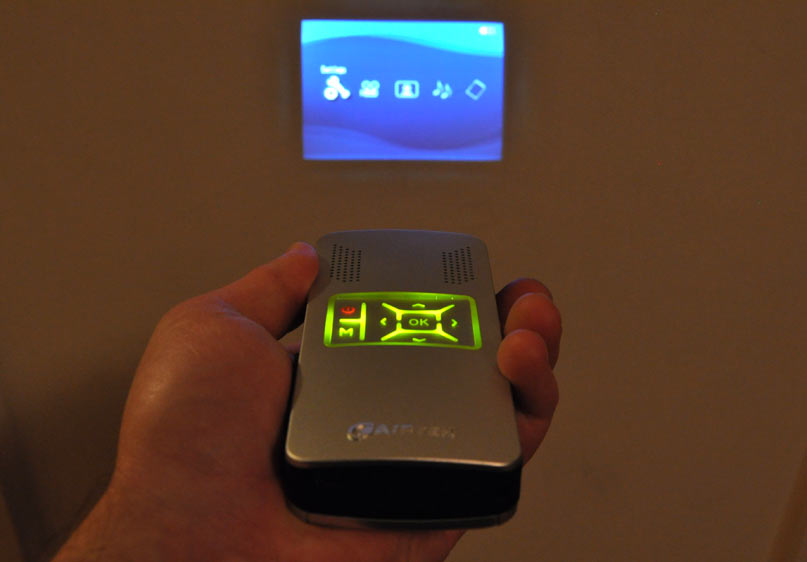 Aiptek’s projector comes with a nice little tripod for quick-and-dirty setup, and a remote control if you’re going to give a presentation. (Speaking of that, the manual recommends converting PPT and PDF files to JPEG and loading them on SD card for best results. Like I said, “quick and dirty.”)