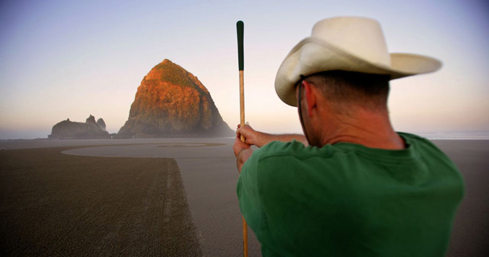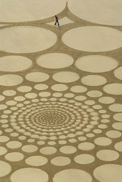 Jim Denevan makes freehand drawings in sand. At low tide on wide beaches Jim searches the shore for a wave tossed stick. After finding a good stick and composing himself in the near and far environment Jim draws– laboring up to 7 hours and walking as many as 30 miles. The resulting sand drawing is made entirely freehand w/ no measuring aids whatsoever.