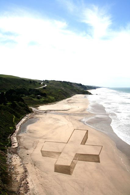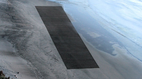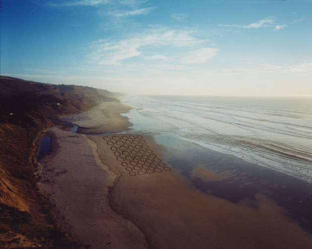 From the ground, these drawn environments are experienced as places. Places to explore and be, and to see relation and distance. For a time these tangible specific places exist in the indeterminate environment of ocean shore. From high above the marks are seen as isolated phenomena, much like clouds, rivers or buildings. Soon after Jim’s motions and marks are completed water moves over and through, leaving nothing.