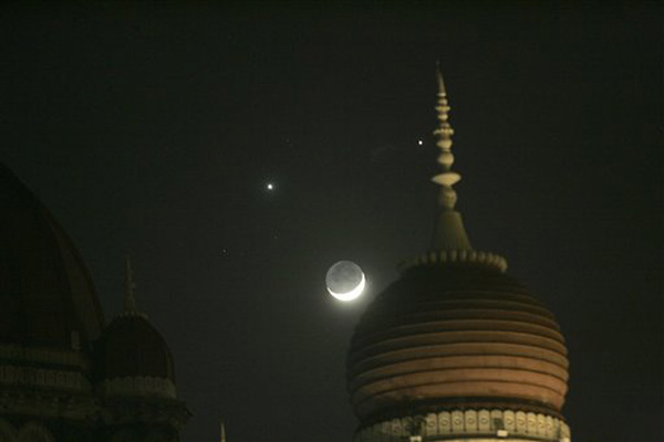 The planets Venus, top left, and Jupiter, top right, came in close proximity with the moon as seen from Earth Monday. In reality, Venus is almost 100 million miles way and Jupiter nearly 550 million miles from our planet. The moon is 252,000 miles away. The exact combination of planets and the moon in the right place to appear together, even when they aren’t high enough in the evening sky to be appreciated, won’t happen again until 2052. [AP Photo/Rajanish Kakade]
