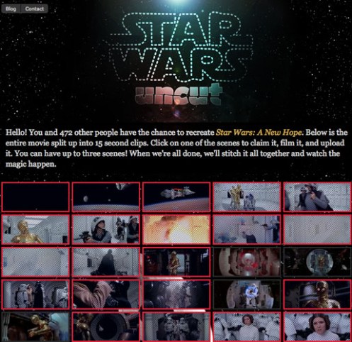 Hello! You and 472 other people have the chance to recreate Star Wars: A New Hope. Below is the entire movie split up into 15 second clips. Click on one of the scenes to claim it, film it, and upload it. You can have up to three scenes! When we’re all done, we’ll stitch it all together and watch the magic happen.