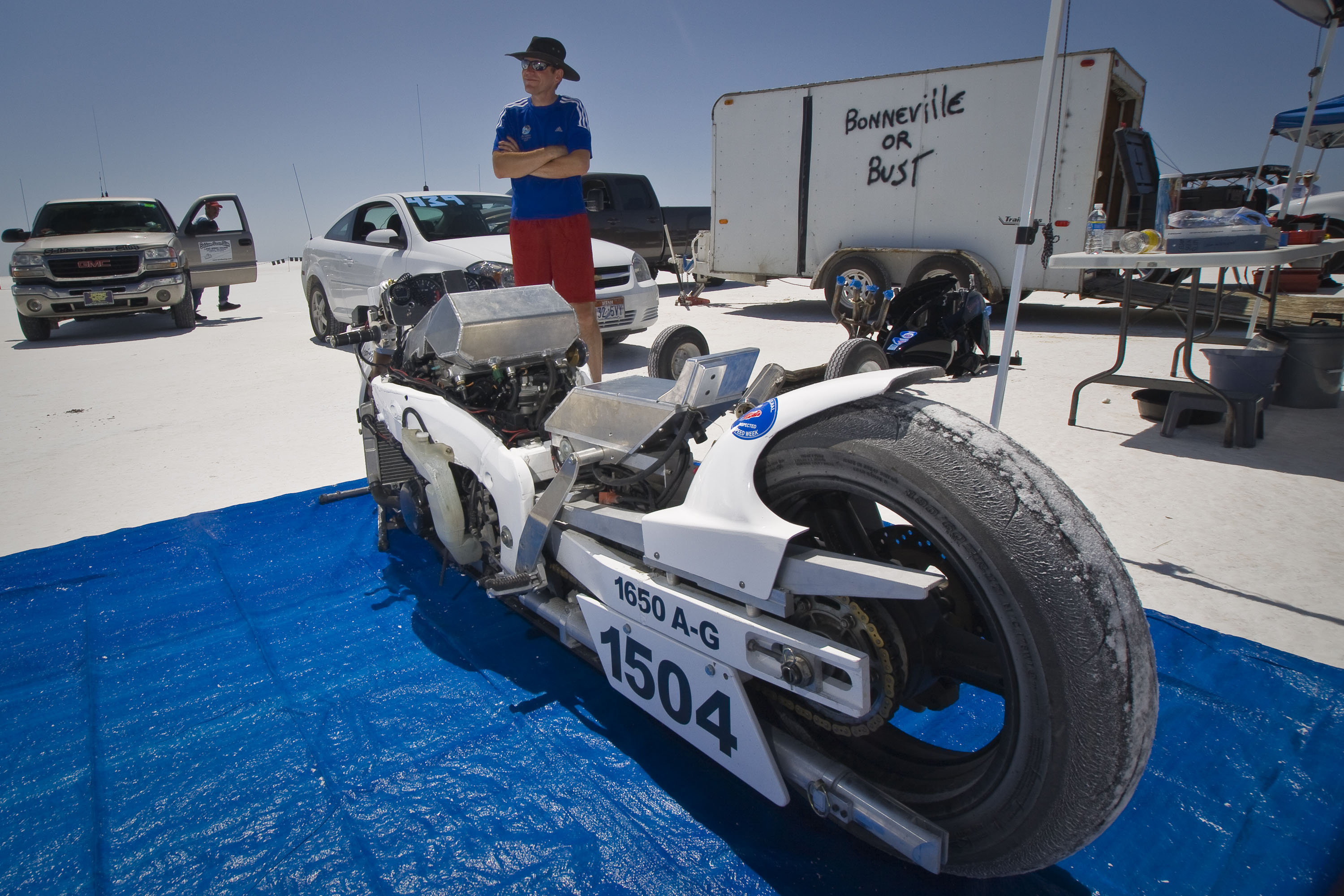 Having come close two days earlier only to have changing track conditions see Veale miss the record by 0.5mph (0.8KPH) this mornings conditions near perfect. The quietly spoken Veale was his normal reserved self allowing himself only a satisfactory smile as he waited in the impound area to have the motorcycle stripped to confirm the legality of “White Elephant” for the 1650cc A-G Class.
