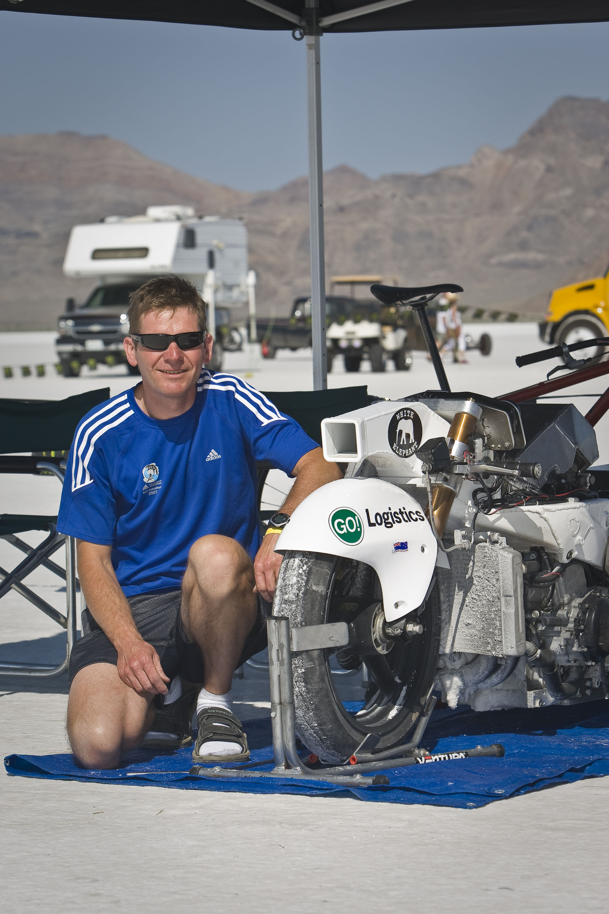 New Zealander Dean Veale from Kaukapakapa, north of Auckland set a new land speed record at the Bonneville Salt Flats in Utah riding “White Elephant”, his Special Construction Hayabusa engine motor cycle: