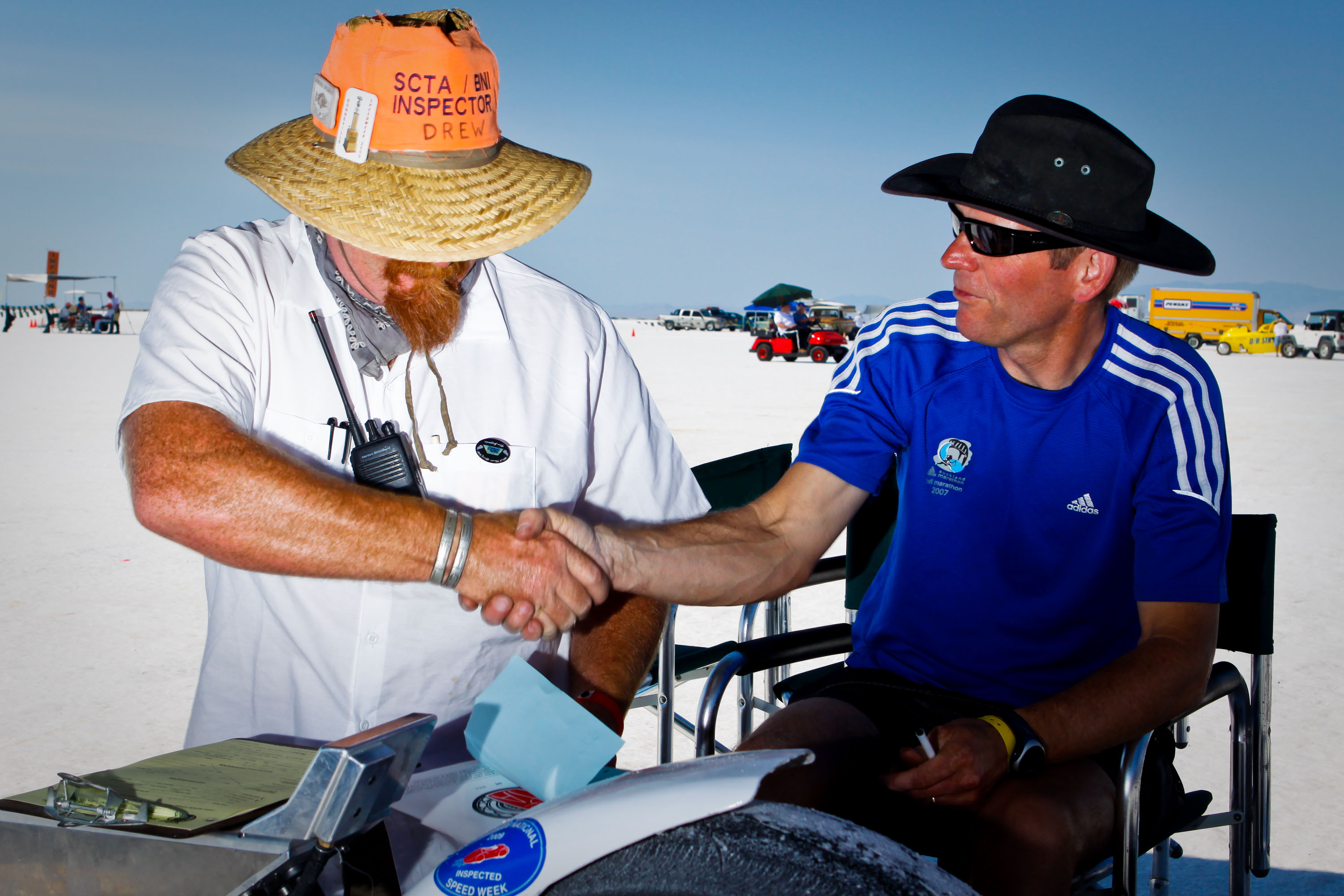 Sitting on a chilly-bin as the SCTA-BNI officials checked every aspect of White Elephant, Veale looked just slightly concerned that something, no matter how small, would require him to repeat his record breaking runs. Eventually the inspector looked up from the paper work and called Veale over. Extending his hand toward Veale the inspector offered his congratulations as he confirmed the record with the words “Welcome to the record books”. [via SCOOP]