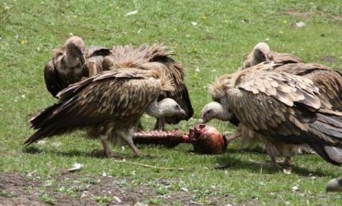 Sky burial or ritual dissection was once a common funerary practice in Tibet wherein a human corpse is cut in specific locations and placed on a mountaintop, exposing it to the elements or the mahabhuta and animals — especially to birds of prey: