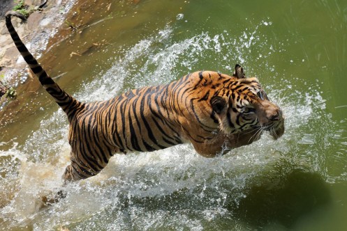 A rare 12-year-old Sumatran tiger named “Trenggani” jumps into the water within its enclosure at Ragunan Zoo in Jakarta, Indonesia on February 12, 2010.