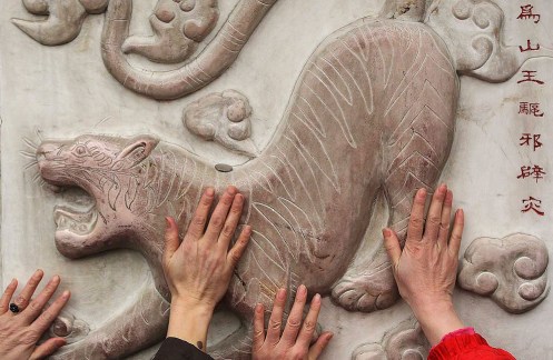 People touch a stone sculpture of a tiger at the Baiyun Guan Taoist Temple to pray for good luck in the Chinese Lunar New Year, the Year of the Tiger, in Beijing, China, Sunday, Feb. 14, 2010.