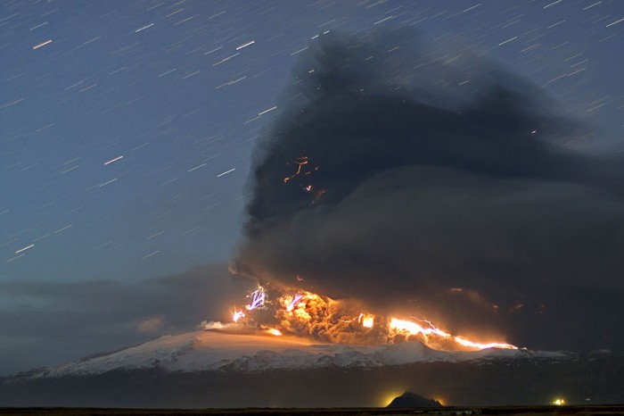 Check out these amazing lightning-laced photographs of the volcano Eyjafjallajokull currently erupting in Iceland. Scientists aren’t sure why electrical discharges are visible during some volcanic eruptions, but: