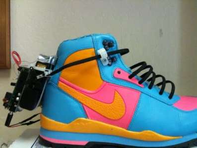 Operation is quite simple- step into the shoe and a force sensor reads the pressure of your foot and activates two servo motors, which apply tension to the laces, tightening the shoe. A touch switch reverses the servos.”