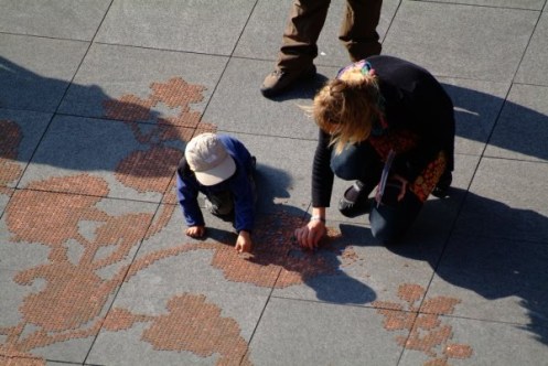 Over the course of 8 days, and with the help of over 100 volunteers, the coins were sorted into 4 different shades and carefully placed over a 300 sqm area. After completion the coins were left free and unguarded for the public to interact with.