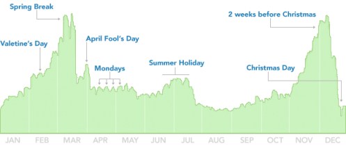 - The lowest day throughout the whole year is Christmas Day… too busy unwrapping material stuff to care I guess (note-to-self: more gifts :P)