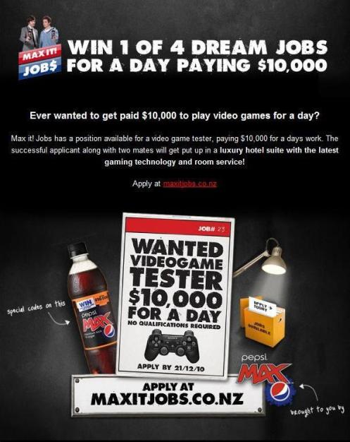 Tags: Coke versus Pepsi "display war", Job Search, New Zealand Jobs, The 50 Worst Video Game Voice Acting Lines EVER!, Videogame Tester Wanted - $10000 For a Day! [Jobs]