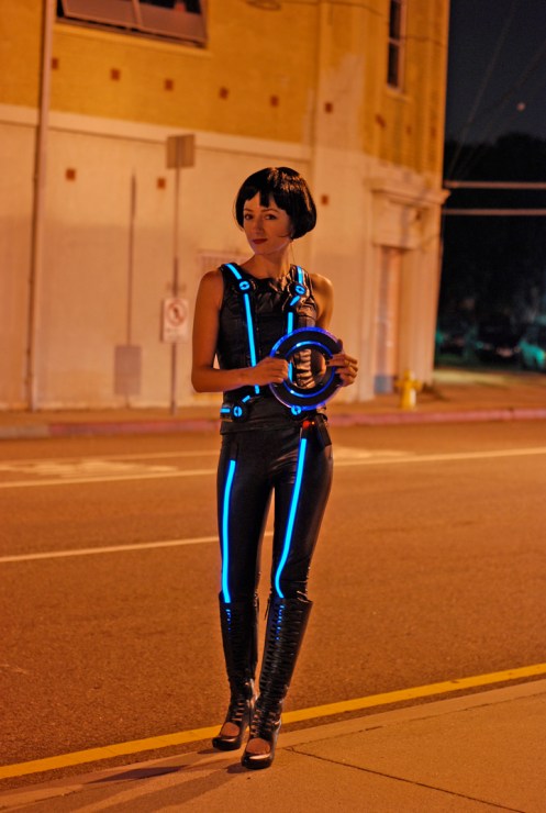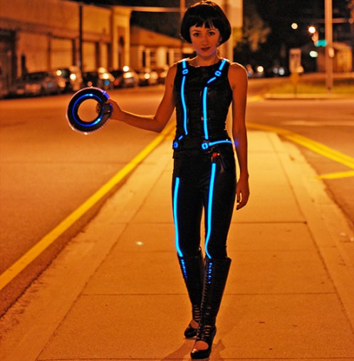 Created by a designer Syuzi, the suit is a mix of faux leather and electroluminescent tape strips (I want some of this) that were specially cut and refashioned to work as Tron-style linings. The luminescent panels are removable, velcored onto the leather vest in order to make the top washable.