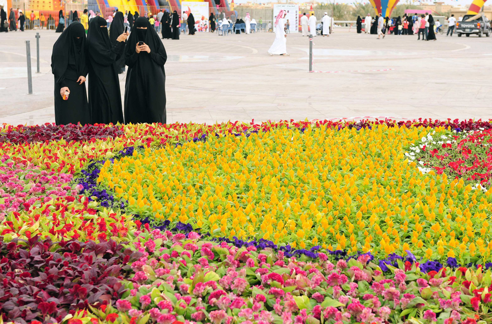 A group of women take photos of flowers at King Abdullah Park during the Rabih Festival in Dammam, Saudi Arabia April 1. [Zaki Ghawas]
