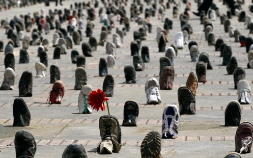 A lone flower is propped up by a boot at a shoe installation marking International Day for Landmine Awareness at Simon Bolivar Square in Bogota, Colombia April 4. On each of the more than 9,000 shoes is the name of a land mine victim representing those injured in Colombia. Colombia is second to Afghanistan as the nation with the largest number of victims. [Fernando Vergara/Associated Press]