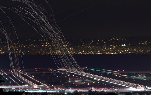 Beautiful long-exposure photos of planes coming and going from San Francisco International: [view the set here]