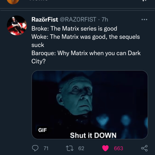 Cool, right? What surprised me most was that there was no mention of Alex Proyas’s DARK CITY. I suppose it was THE MATRIX’s twin film (https://en.m.wikipedia.org/wiki/Twin_films).