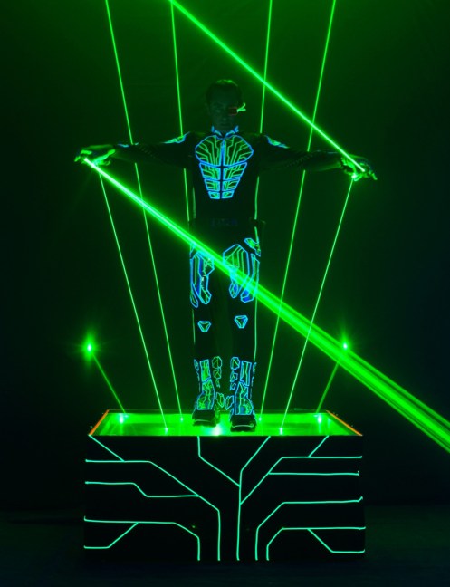 Pretty cool. This is the type of entertainment we will come to expect from our strippers of the future. Seriously, lasers are cool and all but I was expecting Laserman to start grinding on a laser pole. Light-bending beams is sweet, but that guy is in the way!