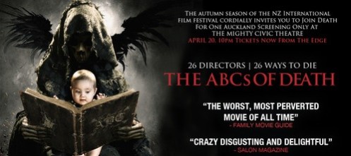 “You are cordially invited to the New Zealand Premiere of THE ABCs OF DEATH, a feature film I produced with Tim League of Austin, Texas and Magnolia Pictures NYC. The film screens in The Mighty Civic Theatre on Sat April 20th, 10pm as part of the Autumn Season of the New Zealand International Film Festival. By the way, when I say ‘cordially invited’, I mean buy a ticket to the event and support my premiere.” ~ Ant Timpson