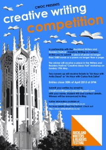 I wrote a short story and won the runner-up prize to see Carlos Ruiz Zafón, guest-headliner as part of the The Auckland Writers & Readers Festival 2013. A major part of the festival spirit — all types of festivals — is discovering new things, and what Zafón had to impart to his attentive theater audience, myself included, was inspiring and related to my style of writing nicely. I’m thinking the CWOC judges may have put two and two together. Either way, cheers CWOC, much appreciated 😀