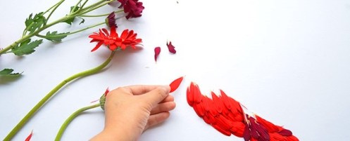 Known for creating images using numerous objects (and playing with her food), Red‘s work is extremely simple yet effective. In her new series, Red has meticulously plucked the petals of pretty flowers to reform them in the image of exotic birds in all their colourful glory: