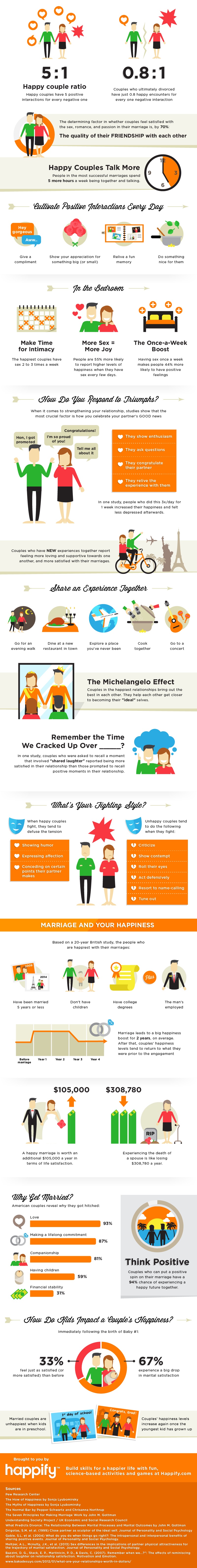 With Valentine’s Day around the corner, it behooves you to keep in mind that you can improve your romantic relationship by celebrating in your partner’s good news every chance you get. No shit. Biochemistry is of course a huge, mysterious factor when it comes to why we fall in love with one specific person over another, but for the tell-tale signs of what makes a happy couple, we can rejoice over scientific research and observations on matters of the heart…brain…lurrrve, represented here in this handy, easy to read infographic: