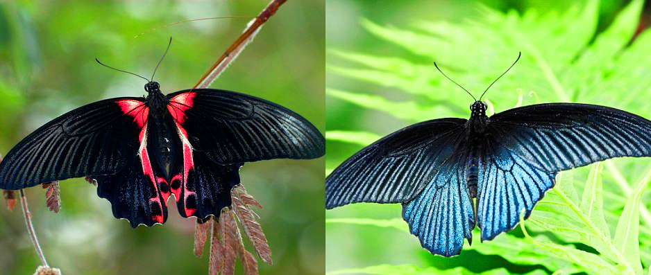 The female (left) and male (right) Papilio Rumanzovia (Scarlet Mormon) Butterfly.