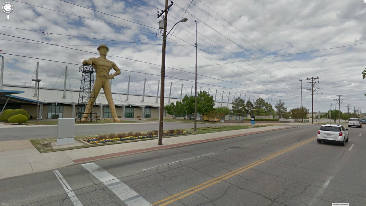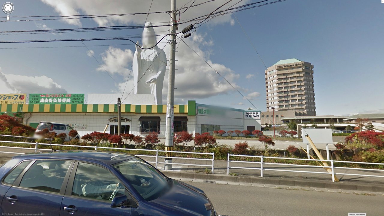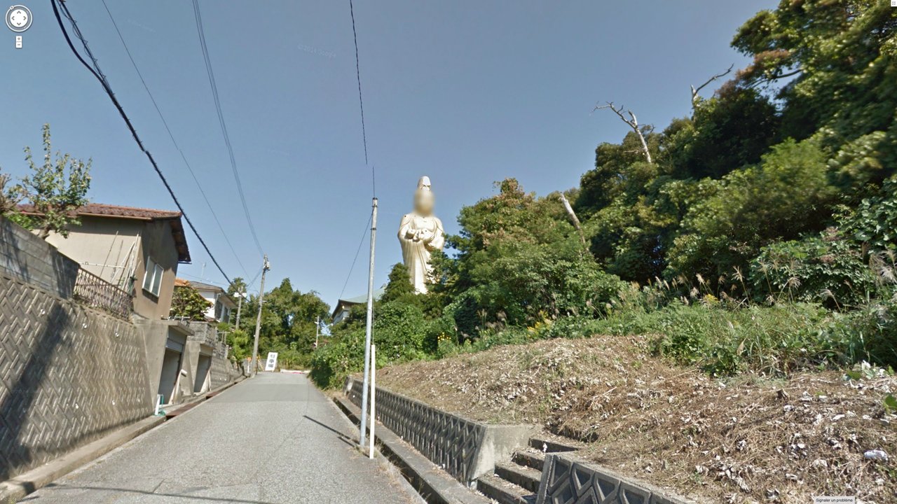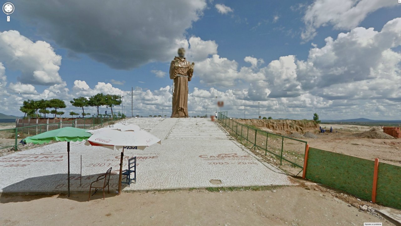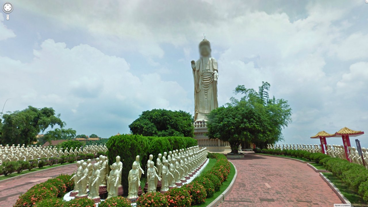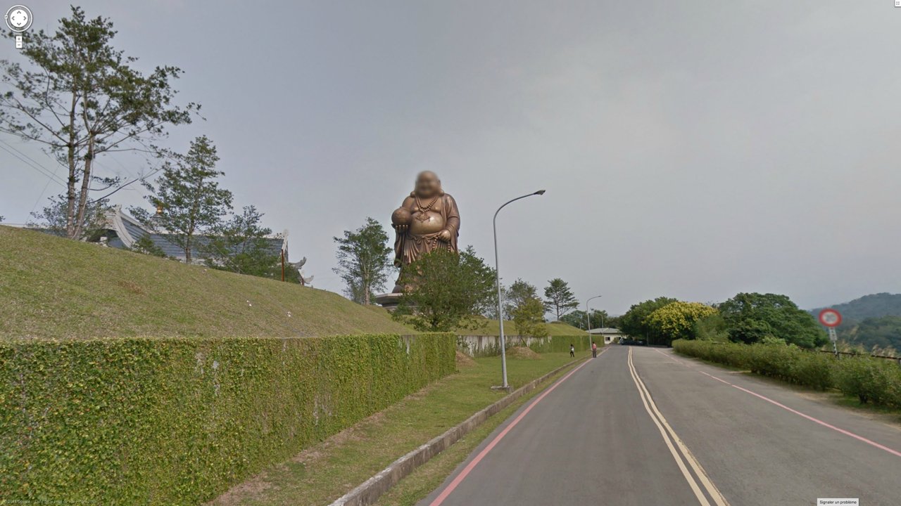 Screen captures from Google Street View, where an algorithmically-powered mapping service system automatically blurs every face it recognises — including those of giant statues, accidentally anthropomorphising these towing deities as living beings: