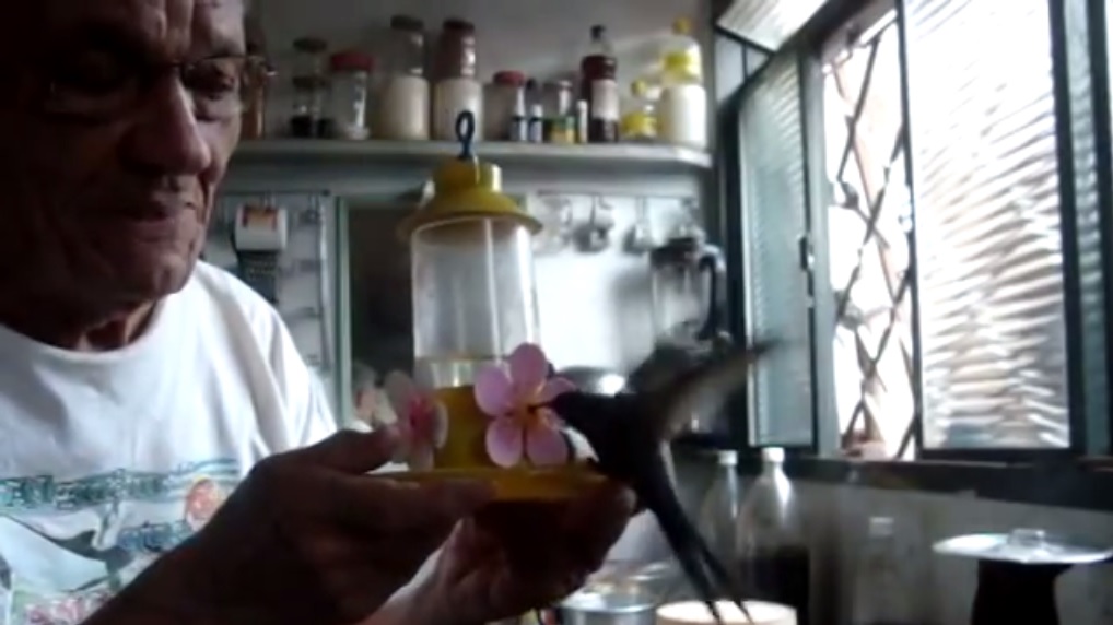 Somewhere in Barretos, Brazil, an elderly man by the name of João Silvestrini, and a hummingbird, are enjoying each others company as one provides nourishment and the other brings joy: