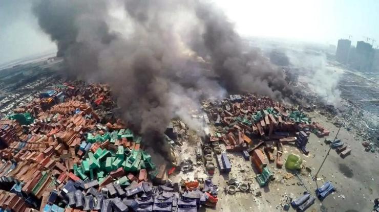 » Aerial footage shows smoke billowing from burning containers the day after the blasts. (Xu Li)