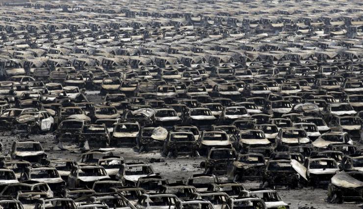 » Hundreds of new cars awaiting export were reduced to shells by the flames. (Jason Lee)