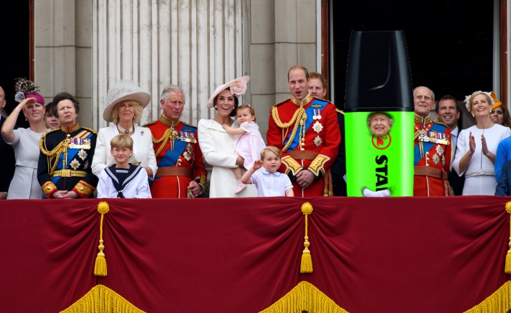 LONDON, ENGLAND – JUNE 11: (L-R) Zara Tindall, Anne, Princess Royal, Camilla, Duchess of Cornwall, Charles, Prince of Wales, Catherine, Duchess of Cambridge, Princess Charlotte of Cambridge, Prince George of Cambridge, Prince William, Duke of Cambridge, Prince Harry, Queen Elizabeth II Prince Philip, Duke of Edinburgh and Sophie, Countess of Wessex watch a fly past during the Trooping the Colour, this year marking the Queen’s 90th birthday at The Mall on June 11, 2016 in London, England. The ceremony is Queen Elizabeth II’s annual birthday parade and dates back to the time of Charles II in the 17th Century when the Colours of a regiment were used as a rallying point in battle. (Photo by Ben A. Pruchnie/Getty Images)