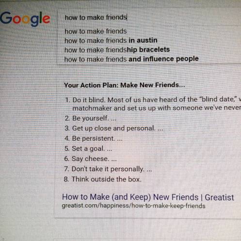 “I dreamt last night that I had a lot of friends and it was fun. So today I googled how to make friends. It was not helpful. lol.”