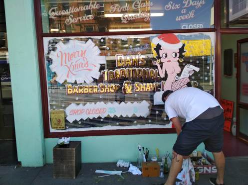 Happy with my purchase and on my way back along K-road, I met a man painting Betty Boop in her birthday suit on a barber shop window. It is that kinda neighbourhood. Funky, thrifty, expensive, sleazy. All of that.