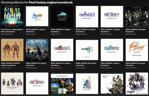 To access the soundtracks, open up Spotify and do a search for “Final Fantasy Original Soundtrack” and click on Albums. It beats the hell out of listening to FF tunes via YouTube vids.