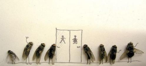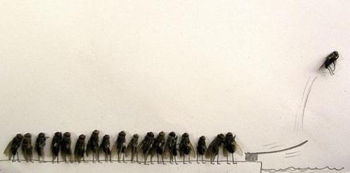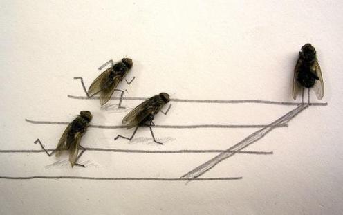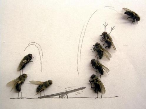Personification of a fly. These are disturbingly funny. By using dead flies, this person has created a series of one-panel comic strips, putting the flies in various positions and then drawing around them with a pencil: