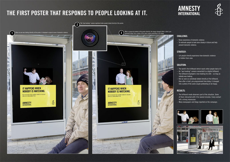 The billboard works by scanning its proximity with an eye-tracking camera, which triggers an image switch on the display panel when it senses someone looking at it. The change only occurs after a brief delay, so that observers understand what’s going on, and get the message.
