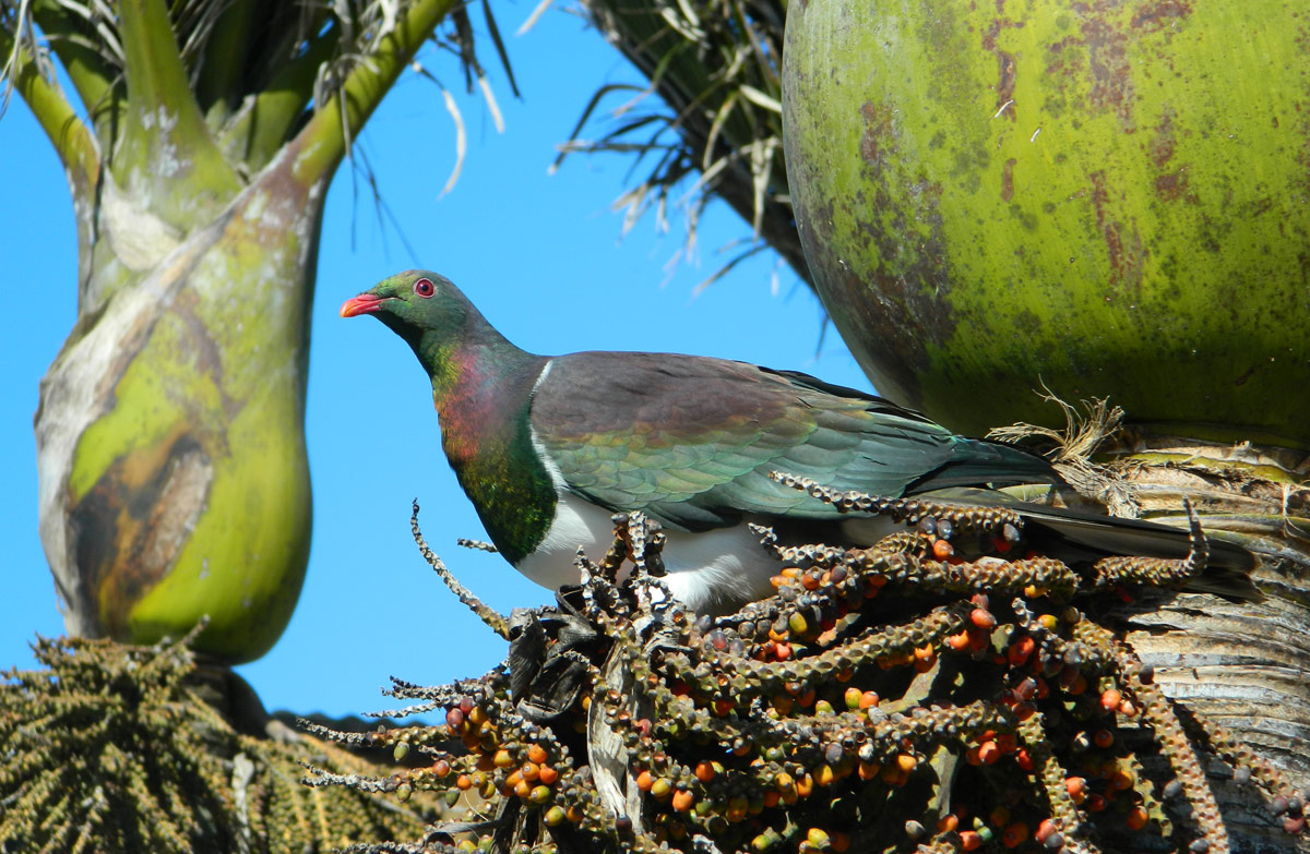 Jumped off the bus, crossed the main road and walked down the next residential street to my parked car. My iPod had died on the bus so my walk lacked its usual soundtrack. But that’s how I heard the Kererū above me, standing on a fruiting spike of a cabbage tree, looking down at me as I stood there looking up at it. I was expecting it to fly away so I stood there for a while and waited. It didn’t fly away though, not in a hurry to be anywhere, it just stood there, looking. If it had been a starring competition, the Kererū won; I carried on walking. It was a beautiful bird. Kererū are exquisite.